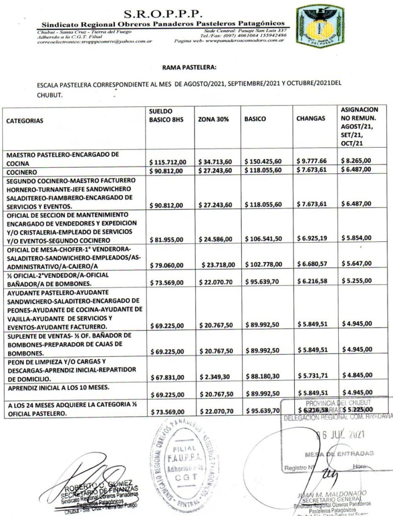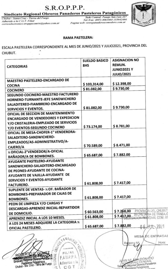 Escala Salarial CHUBUT | Pasteleros | Junio 2021 ~ Mayo 2022 Publicada en 7 julio, 202110 enero, 2022 por panadero