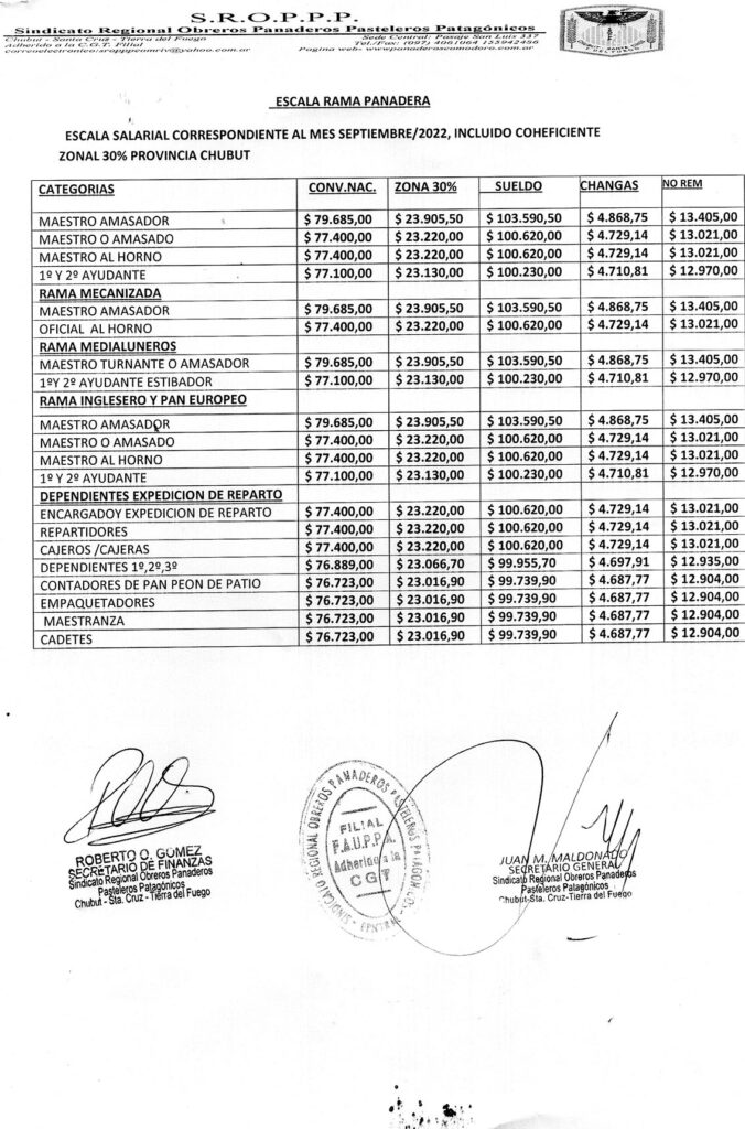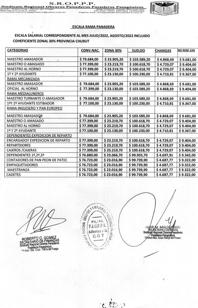 Escala Salarial CHUBUT | Panaderos | Julio, Agosto, Septiembre 2022 Publicada en 9 agosto, 2022 por panadero
