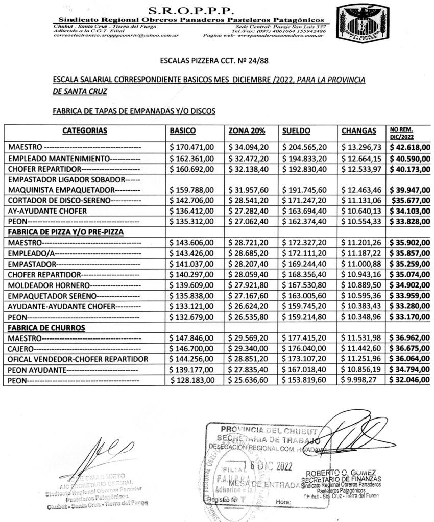 Escala Salarial correspondiente a sueldos básicos del mes de diciembre (2022) para la provincia de Santa Cruz, República Argentina.