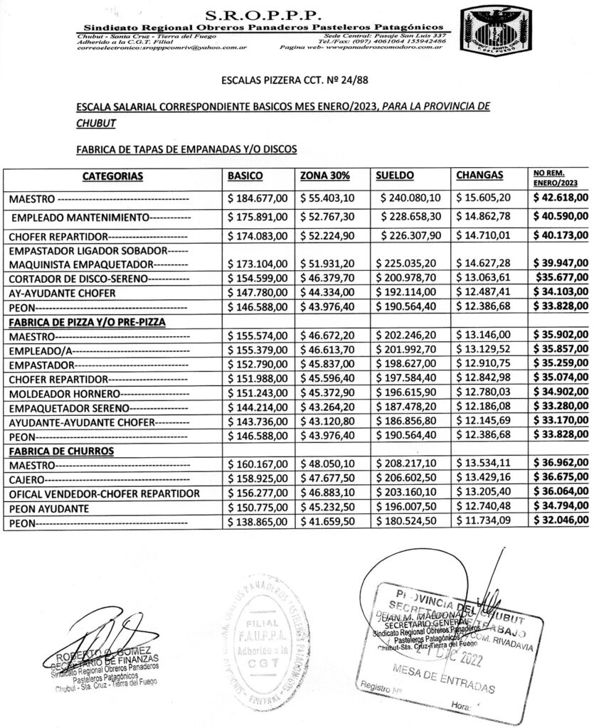 Escala Salarial CHUBUT | Pizzeros | Enero 2023